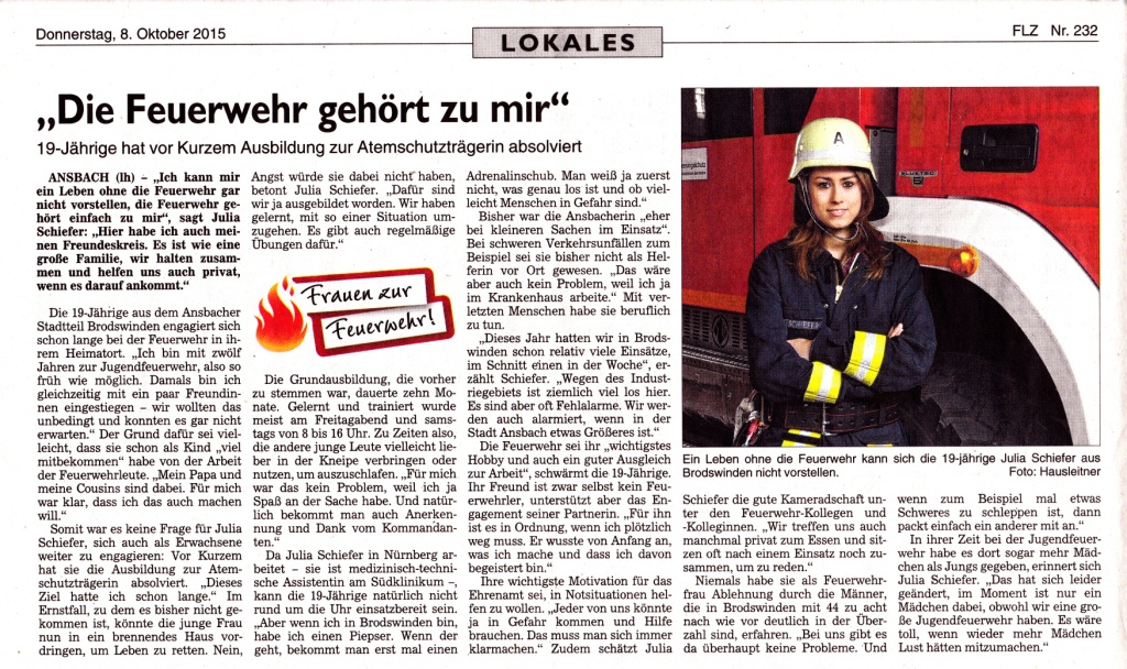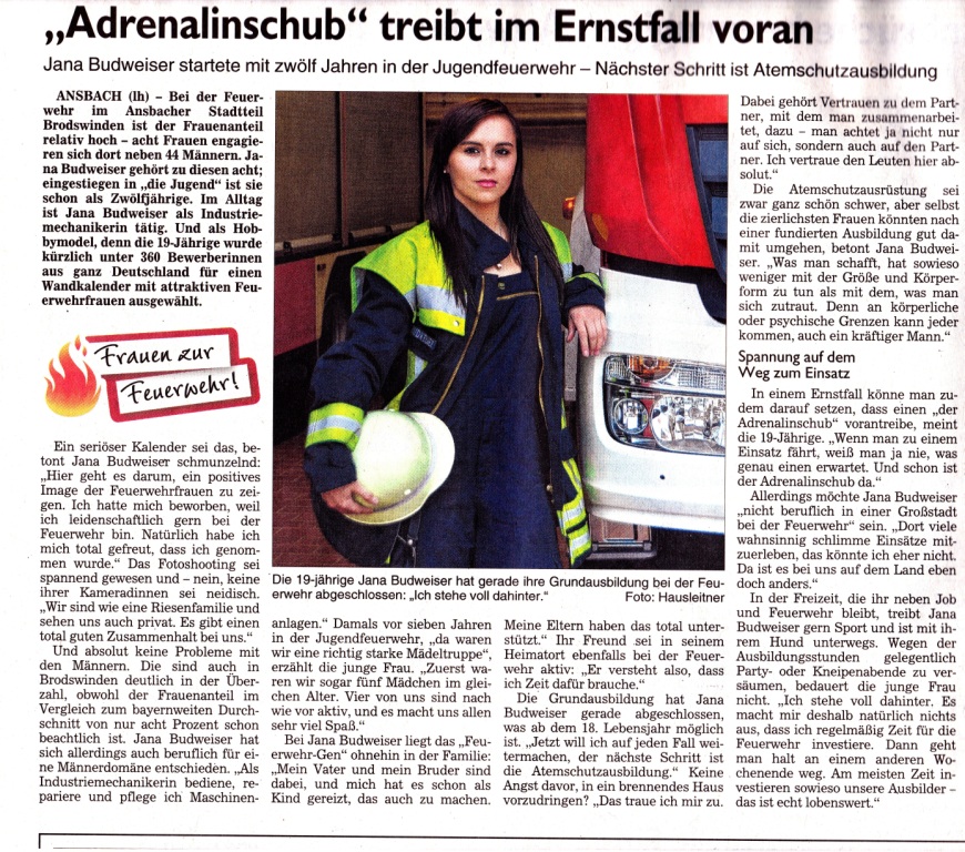 Hier gibts die beiden Zeitungsartikel die in der Fränkischen Landeszeitung zum Thema "Frauen bei der Feuerwehr"" veröffentlicht